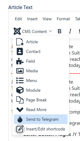 This button appears directly inside the Joomla editor. While writing or editing an article, you can click it to open a pop-up window that prepares the message for Telegram.