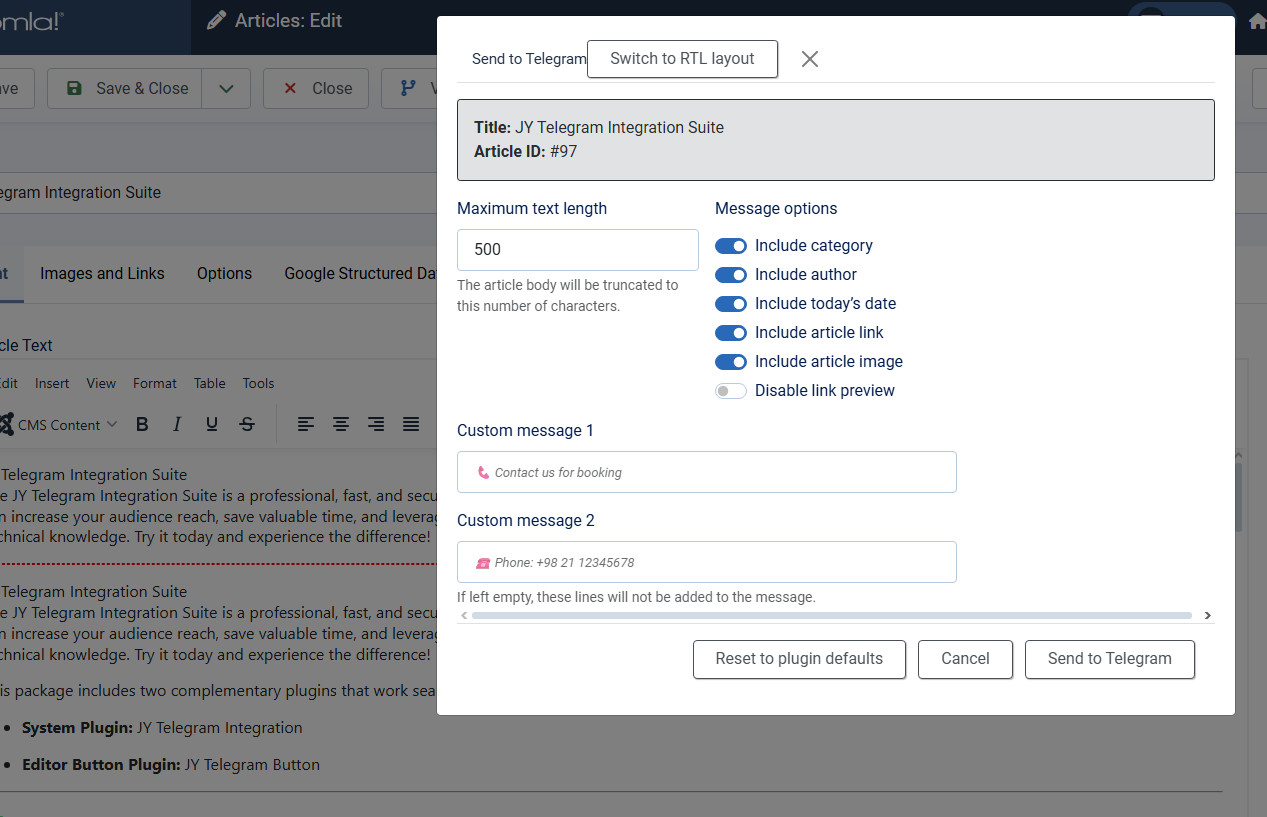 This plugin fully integrates Joomla with Telegram, turning the entire publishing process into a single click.